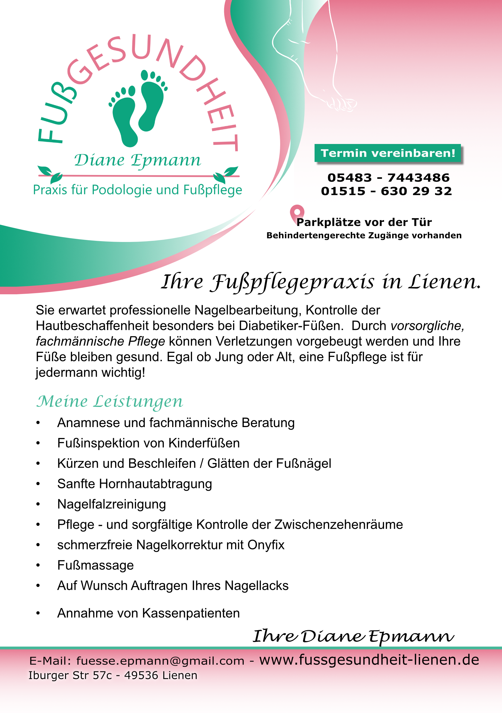 Ich freue mich darauf, Ihnen zu helfen, Ihre Füße gesund und gepflegt zu halten. Erfahren Sie mehr über mich und mein Angebot!
