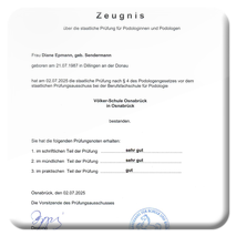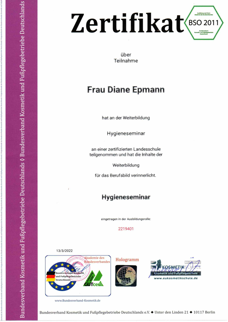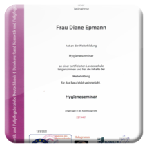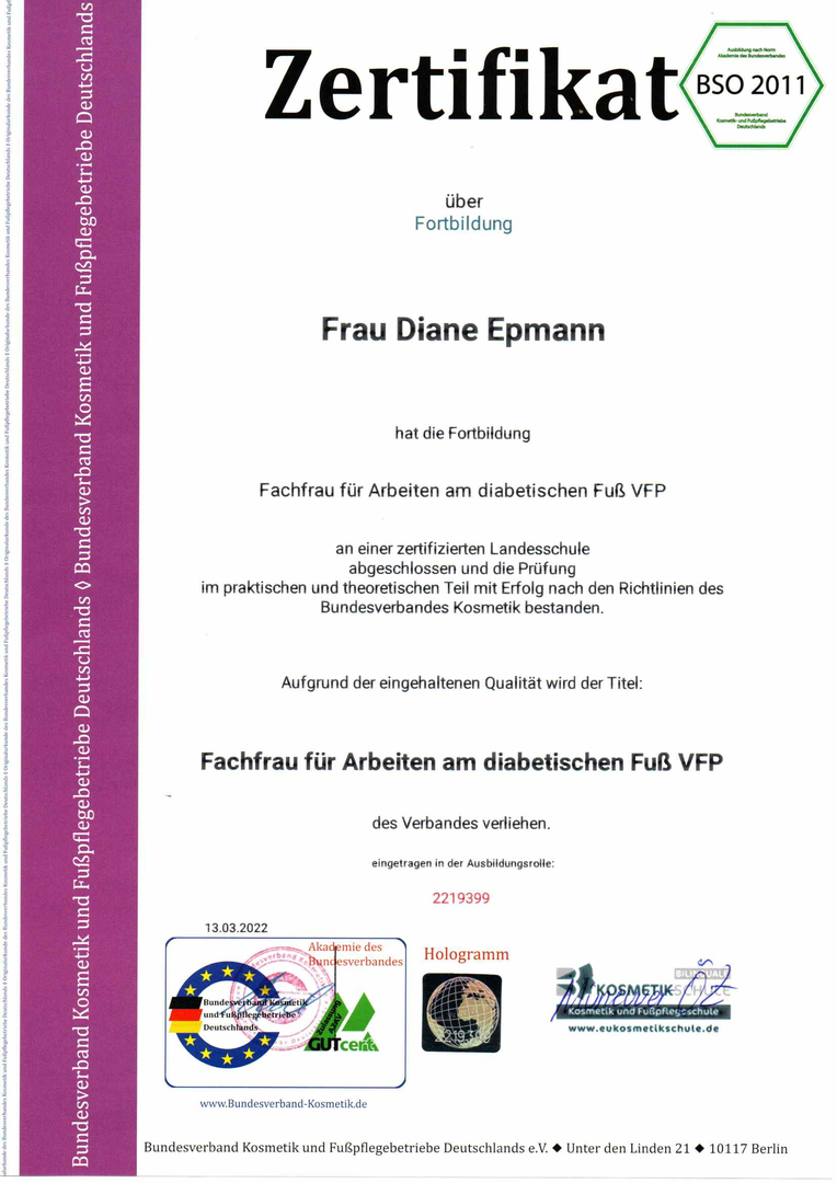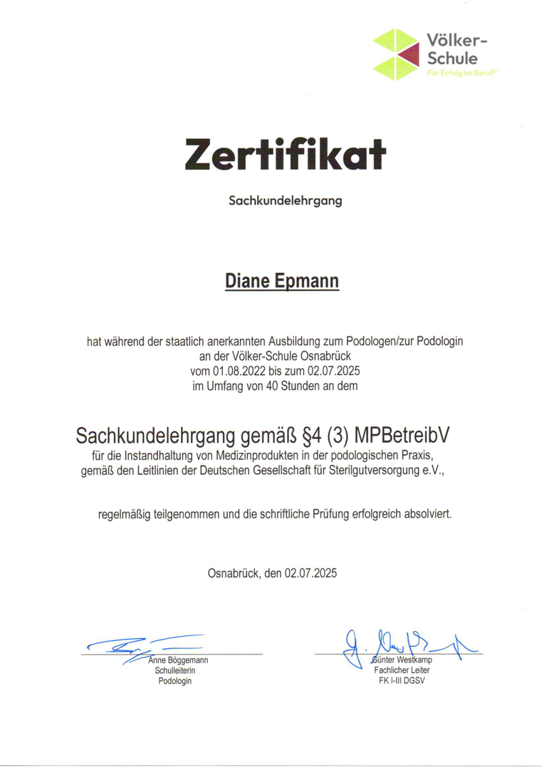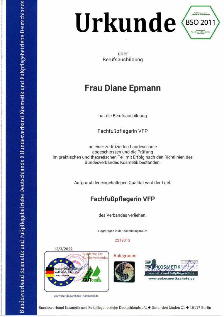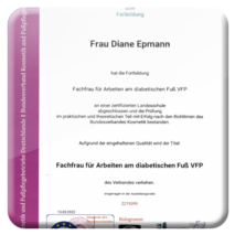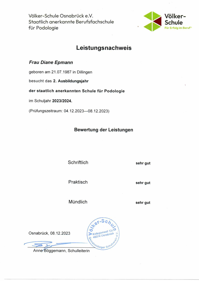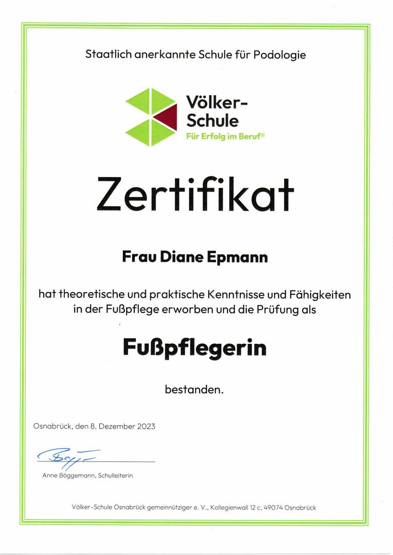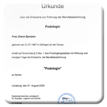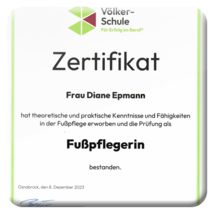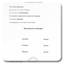 Ich habe meine Zwischenprüfung mit einer Meisterleistung abgelegt und biete nun professionelle Fußpflege und Podologie an.