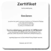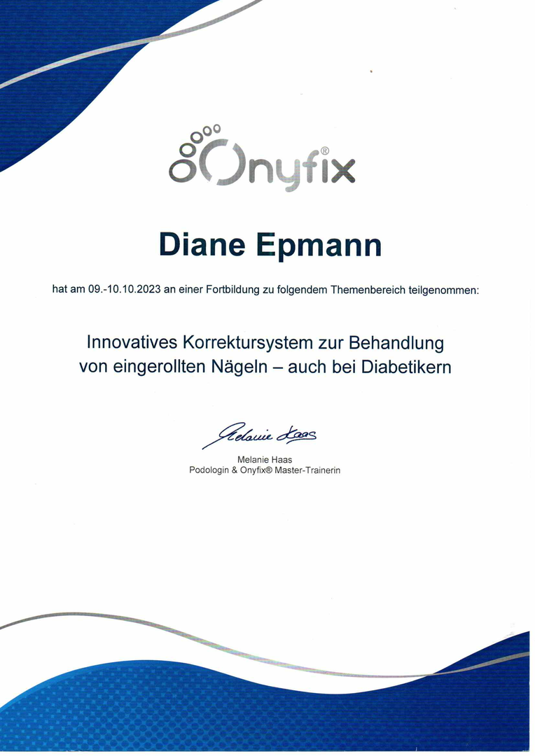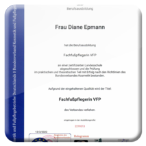 Ich bin eine leidenschaftliche Fußpflegerin mit einem hohen Anspruch an professionelle und sorgfältige Arbeit. Weiterbildung war mir schon immer besonders wichtig – deshalb habe ich zahlreiche Fachkurse absolviert und nun auch meine wichtigste Qualifikation erfolgreich abgeschlossen: die Ausbildung zur Podologin.