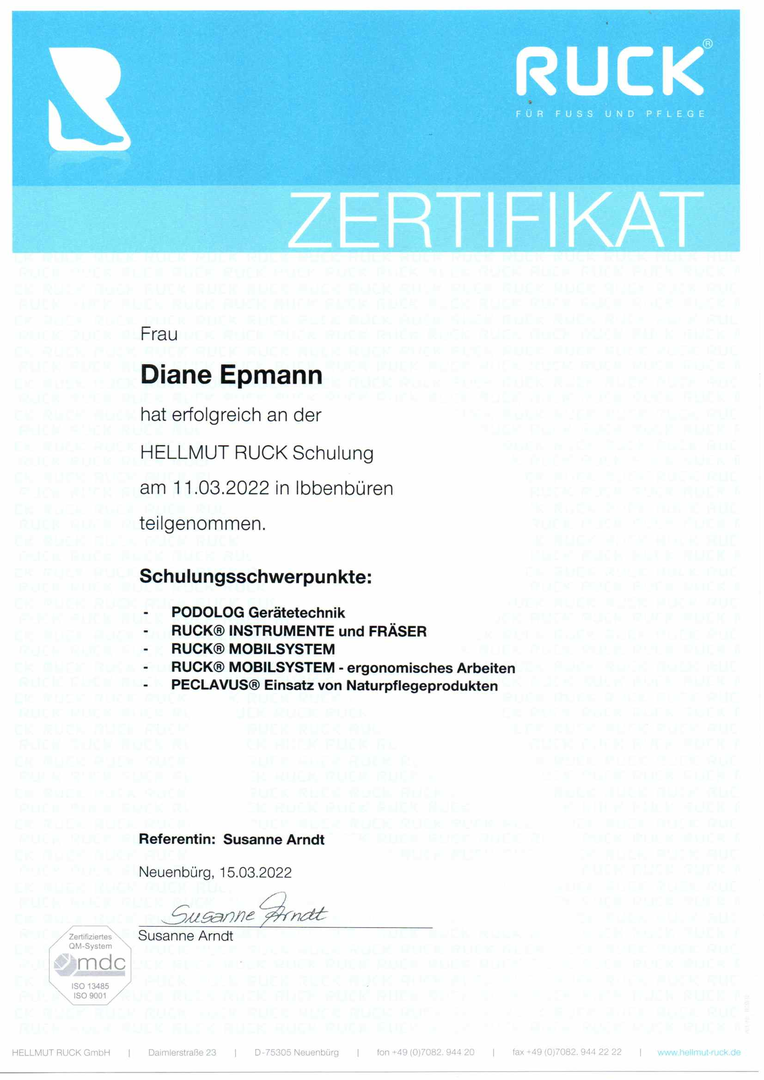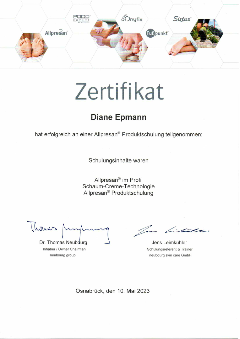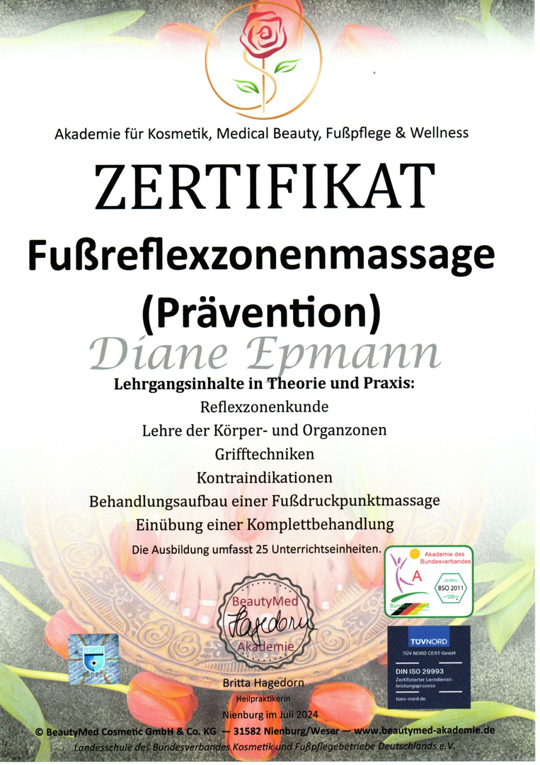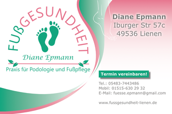 Hallo und herzlich willkommen auf meiner Webseite "Fußgesundheit Diane Epmann"! Mein Name ist Diane Epmann und ich bin voller Leidenschaft für Fußpflege und Podologie. Geboren im Jahr 1987 und Mutter von drei Kindern, habe ich zunächst eine Ausbildung in der Altenpflege absolviert, gefolgt von einer Verwaltungsausbildung. Seit 2018 befinde ich mich in Elternzeit und habe im Jahr 2022 meine Leidenschaft für Fußpflege und Podologie entdeckt. Ab August befinde ich mich im dritten Lehrjahr und freue mich darauf, meine Fähigkeiten weiter auszubauen.